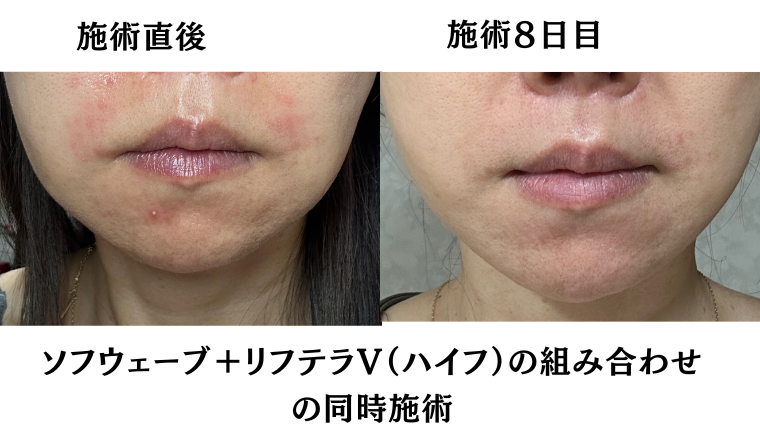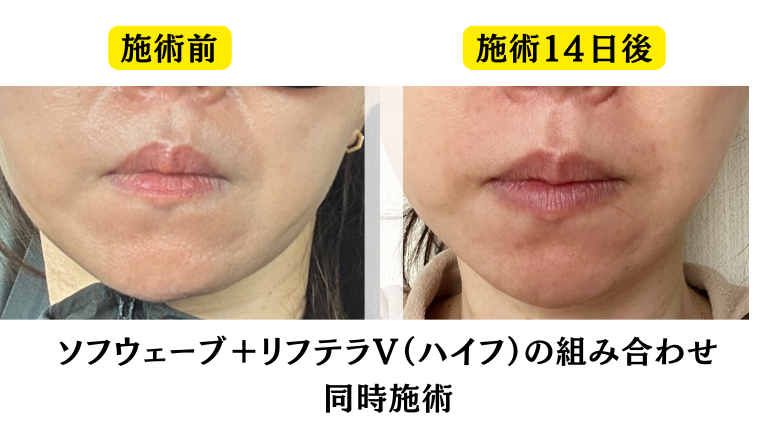 今回はソフウェーブ+リフテラV(ハイフ)の組み合わせの同時施術しました。