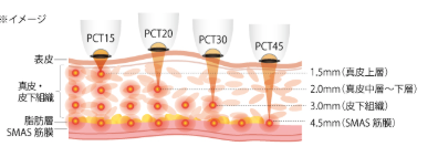 皮膚の表面、かつ真皮下層以下の組織には熱のダメージを与えずに、真皮1.5mmを中心とした比較的浅い層を狙って、60~70℃の円状のトリートメントゾーンを安全に形成させることができます。